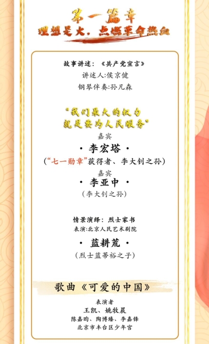 节目第一篇章,以“理想是火,点燃革命热血”为主题,从一本距今已有101年历史的《共产党宣言》中文全译本展开故事讲述。