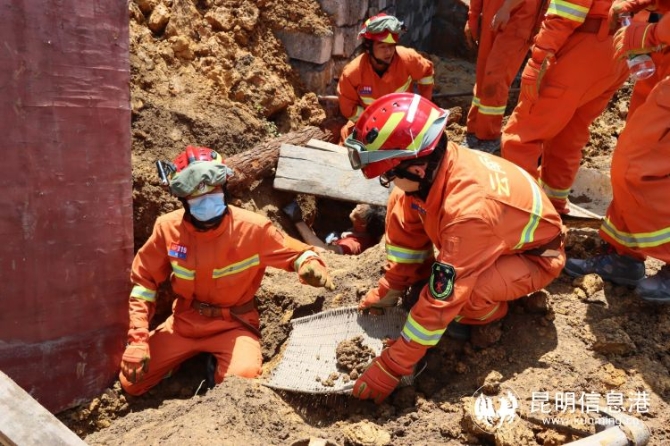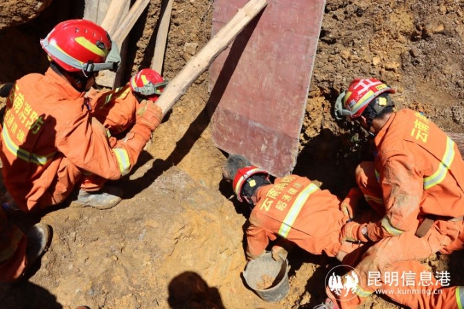 随即,第一小组救援人员立即转战配合第二小组救援人员,争分夺秒解救另一名被困男子。每一名救援人员不敢有丝毫停歇,经过大家努力,另一名被困男子的半个身体也被成功清理出来,但右小腿还被死死埋压在土块下,无法站起来。