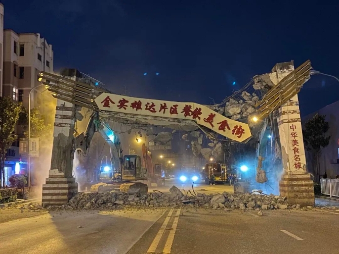 “金实雄达片区餐饮美食街”牌坊破拆现场