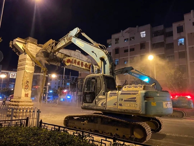 9月2日0时24分,昆明市盘龙区“金实雄达片区餐饮美食街”第一块牌坊破拆成功;2时15分,第二块牌坊随之落地。