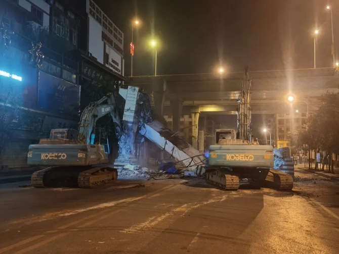9月1日23时,3台带破碎头的挖机准时入场。“出于夜间施工安全的考虑,我们使用全机械化操作。从横梁到立柱,依次先破拆混凝土,再切割钢筋体,最后清运垃圾、恢复路面整洁。”负责拆除工作的云南环奥安装工程有限公司副总经理孔令波告诉记者,当天施工方协同交警、城管、安监、街道在周边设置了前后50米的安全断交范围,做到了“工完料尽、场地清”。