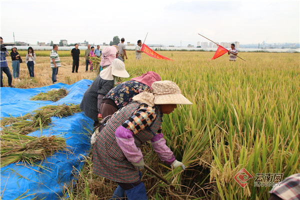 站在位于大屯街道新瓦房社区第四小组的超级杂交水稻个旧示范基地旁,远远可见一片黄灿灿的稻田,迎风而来的是阵阵稻谷的清香。走到稻田边,满目皆是沉甸甸的稻穗,个个颗粒饱满。上午9时许,测产验收工作正式开始。稻田里,村民们分工协作,有的忙着挥镰收稻,有的忙着运稻,有的忙着打穗脱粒,呈现出一派忙碌而欢乐的场景。