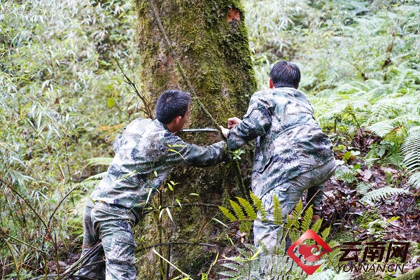 工作人员在查看水青树的生长情况。昌宁融媒体中心供图