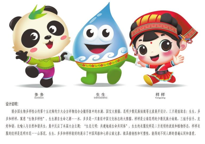 设计说明:联合国生物多样性公约第十五次缔约方大会吉祥物结合会徽形象中的水滴、国宝大熊猫、昆明少数民族姑娘等元素展开设计,三只萌娃取名:生生、多多和样样,寓意“生物多样性”。生生源自生命之源——水,多多是一只象征中国文化标志的大熊猫,样样是云南昆明的少数民族小姑娘,三娃手拉手,友好和谐,比喻人与自然和谐共生,集中反映了本届大会主题“生态文明:共建地球生命共同体”。生生的衣服纹样是二方连续的波浪和植物形态,样样衣服的纹样是云南省花——山茶花。生生、多多和样样较好地展示了中国风格和七彩云南元素,极具排他性和可塑性,能得到不同人群的普遍认同和喜爱。