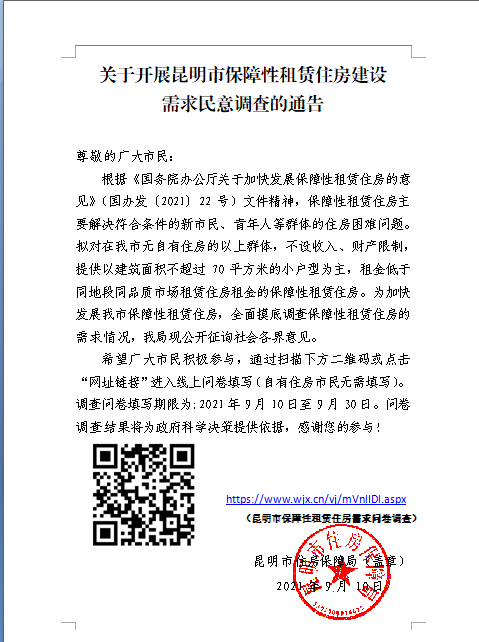 昆明市住房保障局于近日下发《关于开展昆明市保障性租赁住房需求调查的通知》(以下简称“通知”),正式启动昆明市保障性租赁住房需求摸底调查工作,全面了解广大市民对保障性租赁住房的需求情况,希望广大市民积极参与,按照通知提示扫码填写问卷。