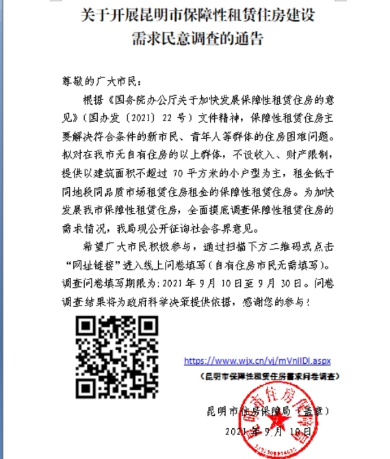 为加快发展昆明市保障性租赁住房,全面摸底调查保障性租赁住房的需求情况,昆明市住房保障局现公开征询社会各界意见。