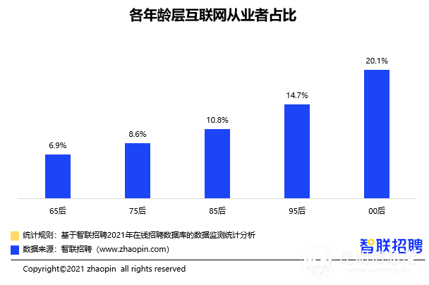 “Z世代”中,有14.7%的95后和20.1%的00后,从事IT/通信/电子/互联网行业,比例明显高于95前各年龄层中从事互联网行业的比例:65后(6.9%)、75后(8.6%)、85后(10.8%)。