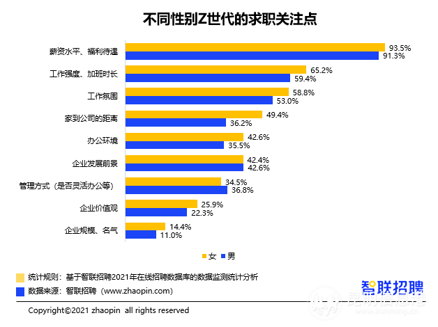 与其他代际人群一样,“Z世代”在求职时最关注薪资水平、福利待遇。93.4%的95后关注薪资水平、福利待遇,该比例比00后高出近5个百分点。看重“家到公司的距离”的“Z世代”女性占比达到49.4%,而男性仅为36.2%。
