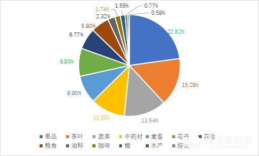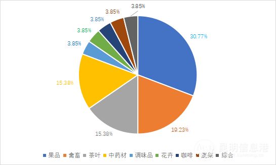在产业类别分布上,入选果品类品牌共计8个、禽畜类品牌(5个)、茶叶类品牌(4个)、中药材类品牌(4个)、调味品类品牌(1个)、花卉类品牌(1个)、咖啡类品牌(1个)、蔬菜类品牌(1个)、综合类品牌(1个)。