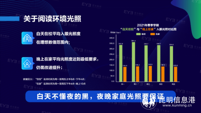 此外,阅读环境光照也是近视发生发展的重要外部环境影响因素,《报告》显示,学生晚上在家平均光照度仅达到最低要求(入眼光照125lux),对比其在学校能达到300lux以上平均光照度,仍需改进提升。