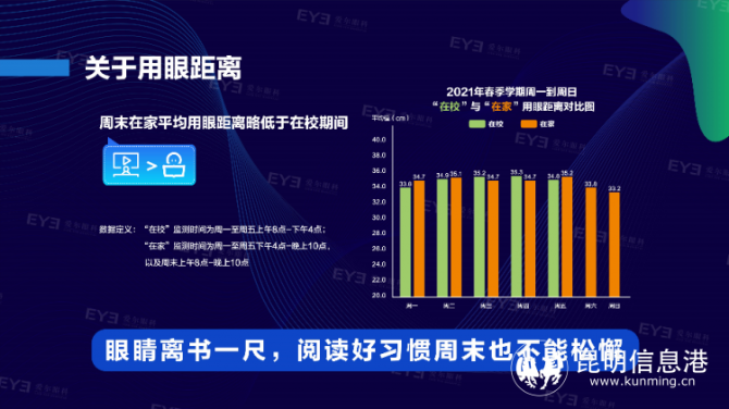 《报告》通过对比2021年3~6月春季学期学生在校和在家的用眼行为和视觉环境差异,发现孩子在家的用眼习惯和视觉环境更差。近距离用眼时长方面,学生晚上在家平均近距离用眼时长均超过2小时,而即使在周末,平均一天近距离用眼总时长也超过4小时,用眼负荷较重。