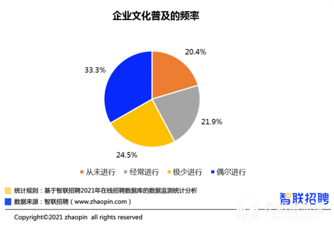 44.9%的职场人表示,所在企业极少或从未进行企业文化普及,33.3%受访者表示“偶尔进行”,表示“经常进行”的占比为21.9%。从不同行业来看,金融业、文体教育从业者表示“经常接受企业文化普及”的比例均为27.7%,高于其他行业。