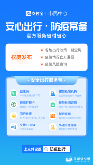 国庆将至,秋高气爽是旅游出行的高峰期,但是眼下的疫情防控工作依然严峻复杂,不能有丝毫松懈。如何度过一个平安充实的假期?国庆出行防疫服务包送上,上支付宝搜“防疫出行”,不仅能够查到权威的“各地出行政策”,还有健康码行程码一页可查、同行自查、核酸检测查询、新冠疫苗接种预约、高速应急服务、违章查询等实用功能,让出门更安心。