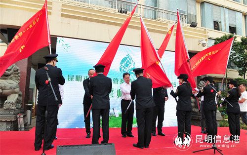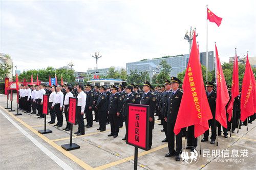仪式现场,全体人员进行了升国旗仪式并奏唱《中华人民共和国国歌》,并向COP15服务保障先锋队授旗,行政执法制式服装着装代表和服务保障COP15先锋队代表分别作表态发言。