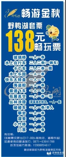 除了各种美食的选择,野鸭湖度假区还准备了如水上乐园、拓展高空、丛林涉猎等共13项精彩户外娱乐,并贴心推出了“畅游金秋 野鸭湖”套票,只需138元,你就可以畅游度假区,并体验所有的户外娱乐项目。