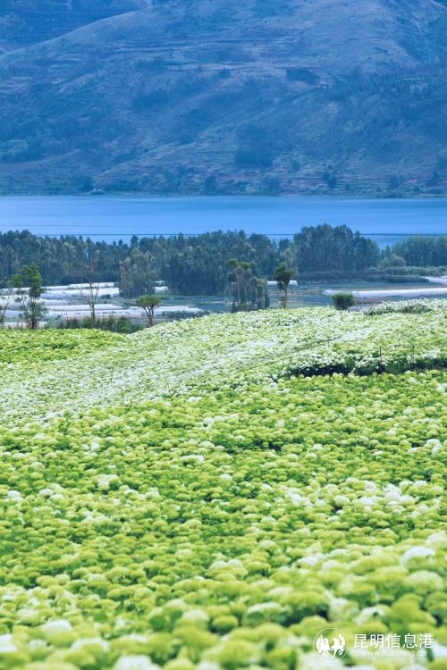 10月6日上午,采访团一行来到昆明市阳宗海湖畔的南国山花庄园,了解该庄园如何努力实现一、二、三产业融合,改善生态环境,加快美丽乡村建设,让荒山变花园。当我们走进了这个宛如爱丽丝梦境里的奇幻庄园,被各种硕大、娇小、艳丽、淡雅的花朵包围着,才终于明白了什么叫“秘密花园”。这是一个神仙农庄,很多绣球、玫瑰、帝王花是是我没见过的品种,已是秋天,大部分绣球花已经凋零,但大片的月季花还在开放,帝王花也还处在盛花期,没凋零的绣球花呈深蓝色,和远处的阳宗海湖面和深蓝的天空交相辉映,别有一番风韵。