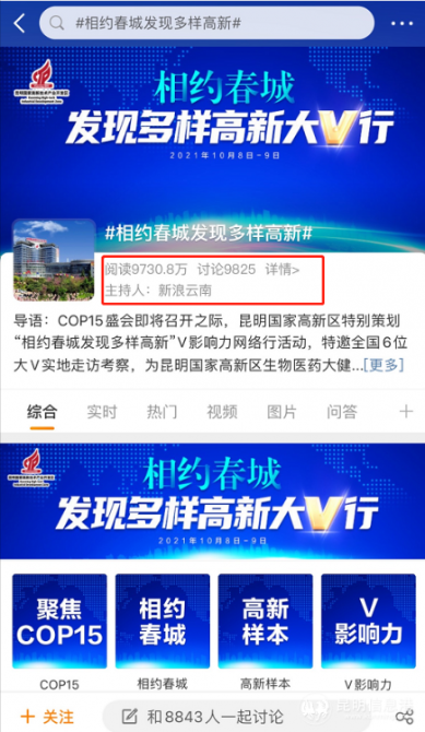通过互动体验、调研采访等形式,以热门话题、文字、图片、创意海报、视频、直播等丰富形式产出优质宣传内容。10月8日至9日,#相约春城发现多样高新#荣登微博热搜第三。截止10月11日,微博话题#相约春城发现多样高新#总阅读量已超9700万,讨论量超9800,整体行程中通过微博热搜、新浪新闻开屏画面、新闻推送推荐等曝光,双端多渠道展开全面内容覆盖及推广。