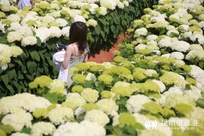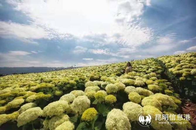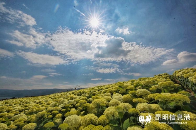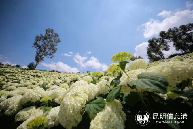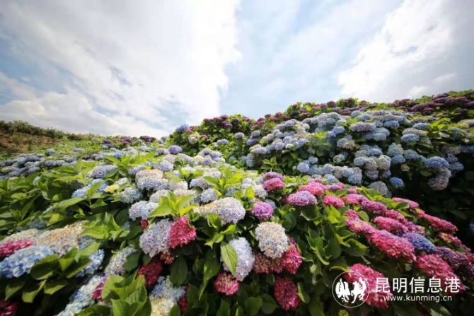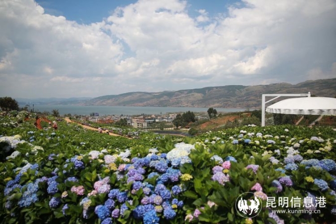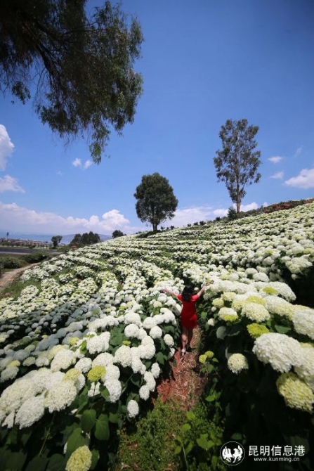 离云南昆明不远的阳宗海畔,有一片占地1300余亩的月季和绣球花田,这里取名“南国山花”,每年5至7月间,能有幸欣赏到这片无边无际绣球花海景观的游客都感慨——置身其中满眼都是美景,是可以忘记一切的“治愈系”花海。