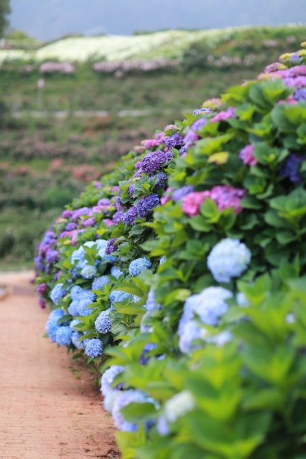 此时,只希望时间静止下来,耳畔只有绣球花儿绽放的声音,还有它们簇拥在一起欢歌起舞的模样。而游客好像已幻化成了一只蝴蝶或者一只蜜蜂,无忧无虑地被放飞于花丛之中。只想在花田中寻找快乐,却原来,快乐不用寻找,到处都是!左看一道道亮白,右看一片片黄粉,近处是铺陈的碎紫,远处是汪洋的星蓝……每一朵花都在向世界优雅地眨着眼睛,这里便是南国山花。
