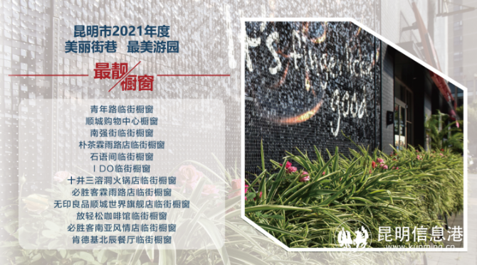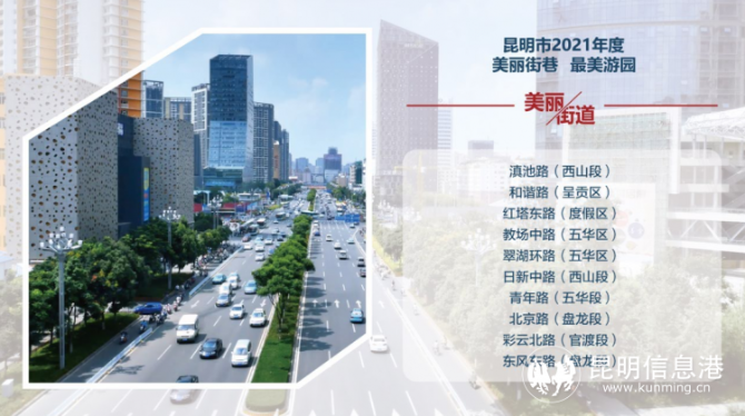 获得“美丽街道”的有滇池路(西山段)、和谐路(呈贡区)、红塔东路(度假区)、教场中路(五华区)、翠湖环路(五华区)、日新中路(西山段)、青年路(五华段)、北京路(盘龙段)、彩云北路(官渡段)、东风东路(盘龙段)。获得“美丽小巷”的有南强街、黄公东街、金兰路、文明街、钱王街。获得“最美游园”的有金碧公园、星光玉兰园、环城北路小游园、晨露园、席子营小游园。获得“最美店招大街”的是北京路、人民路。获得“最靓橱窗”的包括青年路临街橱窗、顺城购物中心橱窗、南强街临街橱窗、朴茶霖雨路店临街橱窗、石语间临街橱窗、I Do临街橱窗、十井三溶洞火锅店临街橱窗、必胜客霖雨路店临街橱窗、无印良品顺城世界旗舰店临街橱窗、放轻松咖啡馆临街橱窗、必胜客南亚风情店临街橱窗、肯德基北辰餐厅临街橱窗。