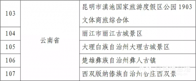 其中,云南省昆明市滇池国家旅游度假区公园1903文体商旅综合体、丽江市丽江古城景区、大理白族自治州大理古城景区、楚雄彝族自治州彝人古镇、西双版纳傣族自治州告庄西双景共计5家单位拟入选。