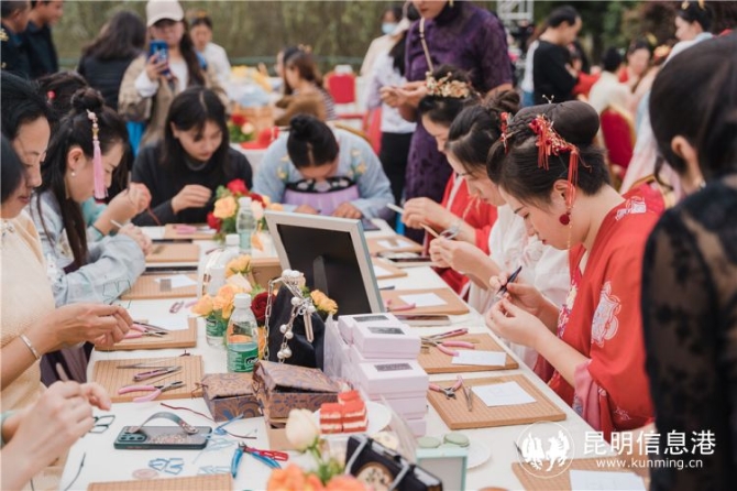 在活动现场主舞台的周围,还设有草本香囊制作、汉服展示、扇面刺绣、面塑等“非遗”文化展台。当天下午, 2021年嵩明县“兰茂文化”城市品牌推介“非遗”展示体验活动就在这里继续。活动现场,草本香囊、盘扣、扇面刺绣、面塑等古典文化项目展台前挤满了人,大家热情高涨,纷纷亲自上手体验,感受传统文化的魅力,以至于草本香囊的布包一度“断货”。