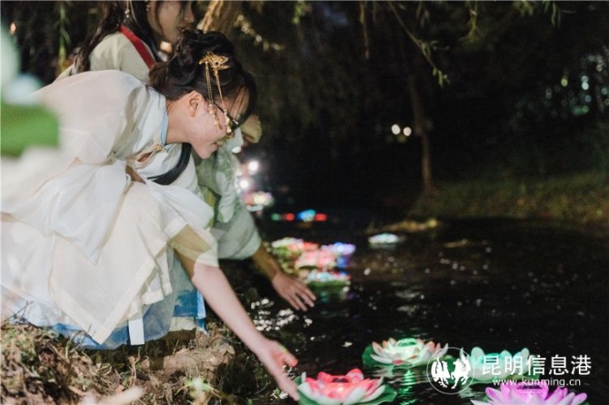夜幕降临,现场灯光次第亮起,在柔和温暖的光线映衬下,整个活动区如梦如幻。随着音乐响起,一组身着精美汉服的年轻人翩然出现,三两成群吟诵兰茂诗词、赏灯、猜灯谜、放河灯、游园,让人“不知今夕是何年”。