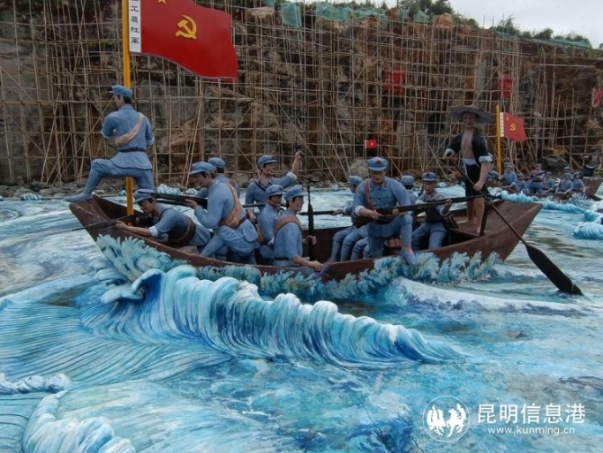 关祥祖介绍,为铭记革命历史,保留当年红军渡江情景遗址,云南新兴职业学院在校园内建设占地约 4800平方米大型中央红军和中革军委巧渡金沙江皎平渡大型群雕情景,雕塑红军 245个,船 7艘,战马 4匹,船工 14人,再现当年中央红军巧渡金沙江皎平渡的恢宏场景。 其中还建设高 15米,宽 30米的“普渡河铁索桥激战”大型雕塑。