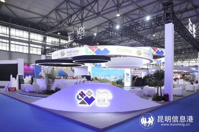 今年文博会,五华区从展区设计到展品陈列都充分结合了“翠湖大文创园”这一主题,以“昆明之眼”为理念,以“小三山一水”(五华山、圆通山、祖遍山、翠湖)对展区进行了概念设计和布局,并以插画的形式,描绘出了翠湖大文创园的区域图。