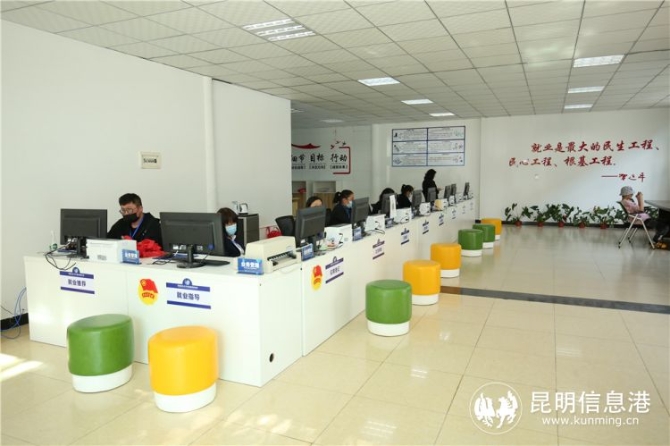 昆明呈贡大学生就业创业市场坐落于云上小镇6栋,以“小园区承载大功能”的建设思路,配备了公共服务大厅、多功能厅、培训直播厅以及办公区和活动区,囊括了公共服务事项办理、各型招聘会、各类培训和直播推介等服务内容。
