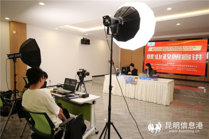 活动现场还进行了2021年云岭大学生就业护航专项行动暨2022届高校毕业生就业服务活动就业政策宣讲视频直播,呈贡区就业局相关负责人化身“政策主播”,在直播间与大学生分享就业、创业扶持政策。