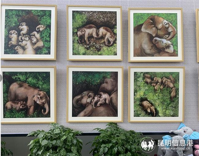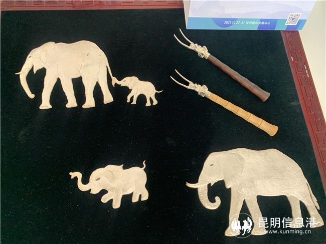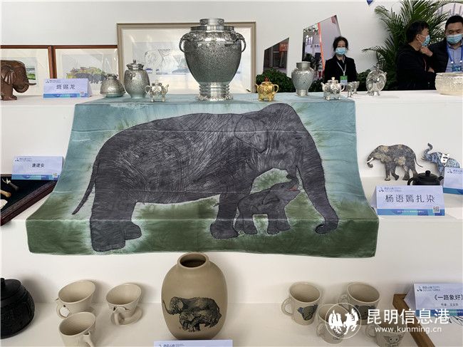 现场还展出了“象往”组画、明信片、锡器、扎染等作品,用云南独有的手工技艺等艺术手法,刻画了象与人和谐共处的画面,制作了与保护大象相呼应的系列作品,呼吁人们关注自然,关注生物多样性。
