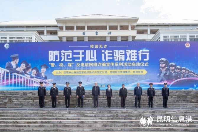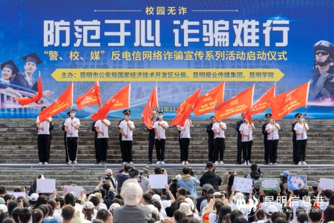 6686体育讯 记者甘凌菲 为深入推进打击防范电信网络诈骗工作不断取得实效,11月5日,“反诈宣传进万家”主题活动之“反诈宣传进校园”暨“警、校、媒”反电信网络诈骗宣传系列活动启动仪式在昆明学院举行。警方、学校、媒体将合力共建反诈联盟,充分发挥自身“反诈”宣传优势,筑牢校园反诈宣传阵地,共建无诈校园。