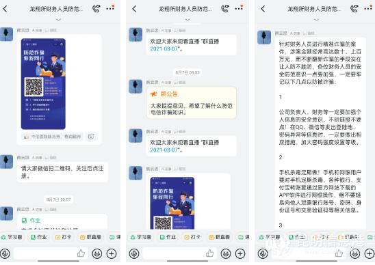 龙翔派出所针对辖区单位、企业组建了反诈钉钉群,开设线上微课堂,为辖区单位、企业人员传授最新反诈知识,在群内发布“金钟罩”注册指南,帮助大家及时完成注册。此外,民警每日在群内转发最新诈骗案例和反诈知识,切实筑牢辖区群众的反诈防线。