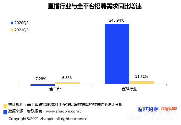 智联招聘数据显示,2021年第三季度直播行业招聘职位数同比增加11.72%,大于全平台岗位增幅(6.82%);直播岗位的求职人数同比增加46.69%,求职者增幅明显大于岗位增幅,也大于去年同期增幅。