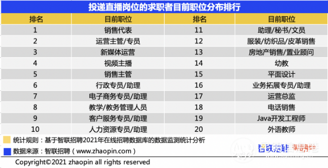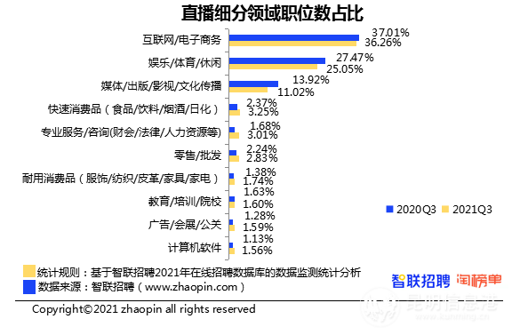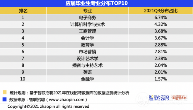 2021年第三季度,直播行业大学生求职人数同比增加69.52%,高于46.69%的行业总体求职人数增幅。应届毕业生专业分布方面,电子商务、计算机科学与技术占据前两位。智联招聘9月发布的《2021Z世代职场现状与趋势调研报告》显示,有10.9%的95后、13.8%的00后想成为电商主播,这一职业排在“Z世代想从事的新兴职业”第三位。