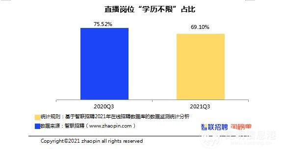 智联招聘数据显示,直播岗位工作经验要求为“经验不限”“学历不限”的占比下降,其中“经验不限”占比从2020年第三季度的79.84%下降至2021年第三季度的73.31%,“学历不限”占比从2020年第三季度的75.52%下降至2021年第三季度的69.10%。在2021年第三季度,有48.11%的直播运营岗位要求1-3年工作经验,从业门槛呈现提高趋势。