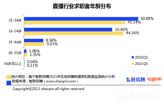 2021年第三季度,直播行业求职者年龄在16-24岁的占比达到44.36%,与25-34岁的求职者比例仅相差不到1%。而2020年第三季度,16-24岁和25-34岁的求职者占比分别为39.40%和50.88%。