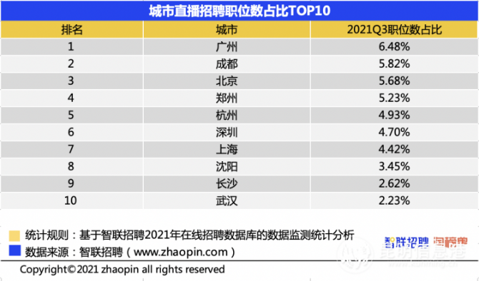 直播人才招聘需求主要集中在新一线与二线城市,二者职位数占比分别是36.73%和23.44%,高于一线城市的21.39%。南方城市职位数占比达59.04%,明显多于北方的40.96%。被誉为“网红五大城市”的广州、成都、北京、郑州和杭州,岗位需求都排在前5位。