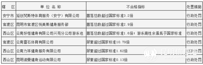 游泳池水水质检测项目为细菌总数、大肠菌群、尿素、游离性余氯、浑浊度、PH值等6项指标。针对10月份抽检不合格6家游泳场所,昆明市卫生健康委员会综合监督执法局将按照《游泳场所卫生规范》要求,依据《公共场所卫生管理条例实施细则》规定,对不合格游泳场所进行行政处罚。各游泳场所要根据自身存在的问题,及时找出游泳池水管理薄弱环节,加强水质处理管理,及时整改,确保游泳池水质符合国家卫生标准和要求。