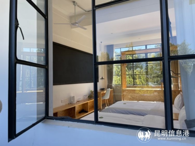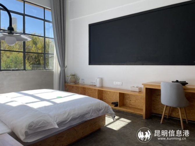 14间具有乡村文创气息的特色客房,每个房间都是一间教室,渐变斑驳的黑板成了装饰,书桌上方悬挂着绿色的锅盖灯,转叶扇替代了空调,室内简单素雅,太阳透过窗户照进房间,圆了多少同学小时候在课堂上躺着睡的梦。
