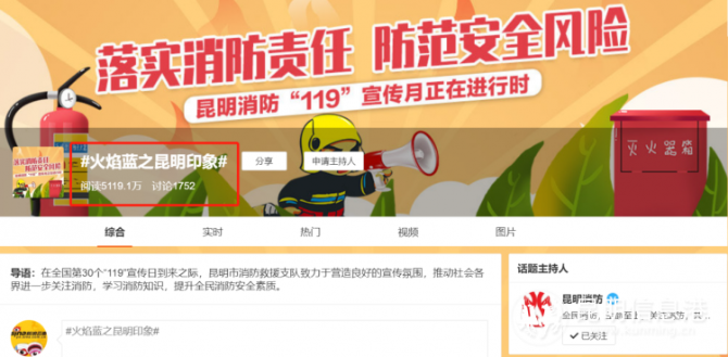 同时,通过在全媒体平台共同打造“119”消防宣传日话题阵地,联动电视媒体、新闻媒体、网络媒体、网络大V,建立“119”全媒体宣传矩阵。通过微博热门话题、文字、图片、创意海报、视频、直播、volg等丰富形式产出优质宣传内容。11月9日至10日,#火焰蓝之昆明印象#荣登微博全国热搜第三。截止11月25日,微博话题总阅读量已超5100万、短视频观看量50万,抖音话题#火焰蓝之昆明印象整体活动观看量近30万,活动热度持续走高,全网话题阅读量突破5180万,打造了专属昆明消防的“宣传样本”,为昆明消防凝聚了强劲的宣传力量,掀起“全民消防”热潮,提升昆明市消防救援支队整体形象和影响力,在全媒体平台实现千万级曝光。