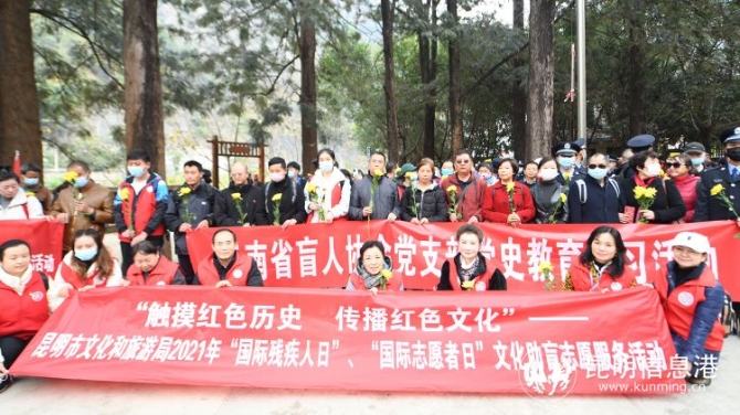 在12月3日“国际残疾人日”、12月5日“国际志愿者日”到来之际,云南省图书馆、昆明市图书馆联合组织昆明市50位盲人在志愿者一对一帮助下,触摸普渡河铁索桥,吊唁红军烈士,向烈士墓敬献鲜花,参观红军长征毛主席路居旧址,聆听红色故事,感受红色文化,省文化和旅游厅一级巡视员马迎春同志以志愿者身份声情并茂地向盲人朋友讲述红军巧渡金沙江的故事,激发了盲人“学党史,听党话,感党恩,跟党走”的革命情怀,让盲人实地体验文化和旅游融合之美,感受新时代美好生活的新气象。
