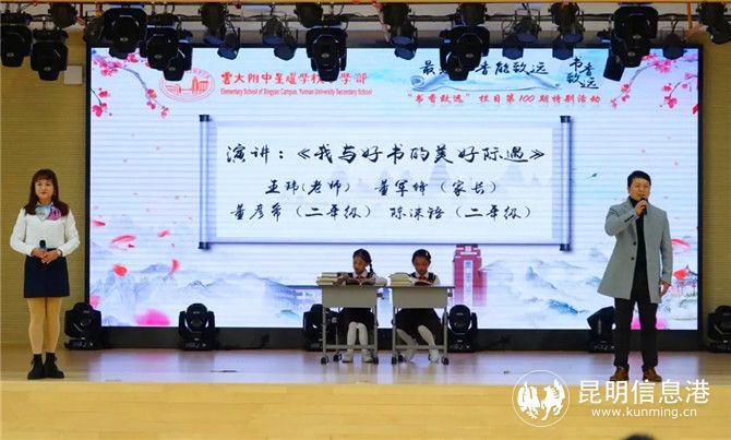 6686体育讯 记者江枫 腹有诗书气自华,最是书香能致远。12月1日,云大附中星耀学校小学部举行“书香致远”100期庆典。当天下午,庆典活动在学校风雨球场举行。杨瑞(老师)、谢宇(家长)、刘远(三年级学生)、许琪琪(六年级学生)共同担任主持人。