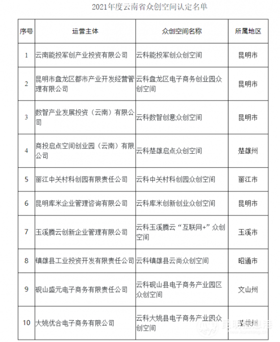 根据《云南省众创空间认定管理办法》(云科规〔2021〕1号),经单位申报、州(市)科技局推荐和省科技厅组织的材料初审、现场查验、专家综合评审、厅务会议审议、公示等工作程序,现认定云南能投军创产业投资有限公司、昆明市盘龙区都市产业开发经营管理有限公司、数智产业发展投资(云南)有限公司、商投启点空间创业园(云南)有限公司、丽江中关村科创园有限责任公司、昆明库米企业管理咨询有限公司、玉溪腾云创新企业管理有限公司、镇雄县工业投资开发有限责任公司、砚山盛元电子商务有限责任公司、大姚优合电子商务有限公司等10家单位为云南省众创空间。