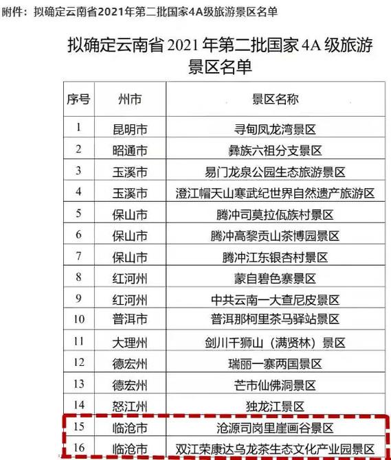 日前,云南省文化和旅游厅公布了云南省2021年第二批国家4A级旅游景区拟确定名单,临沧沧源司岗里崖画谷景区、双江荣康达乌龙茶生态文化产业园景区拟评定为国家4A级旅游景区,占全省拟评定景区的八分之一。