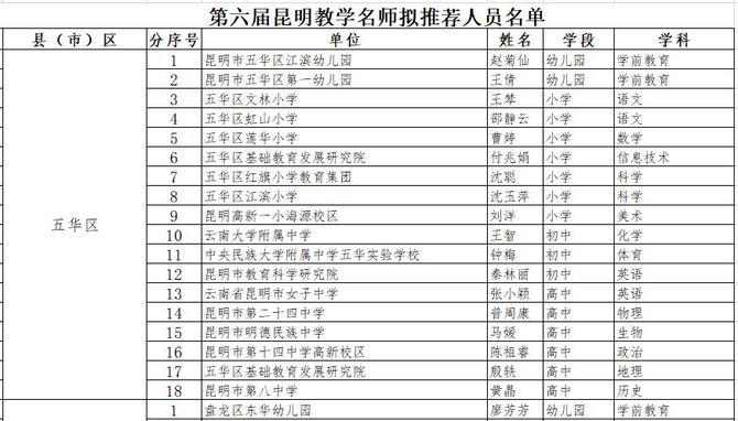 第六届昆明教学名师拟推荐人员名单