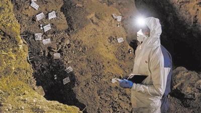 一名研究人员记录了墨西哥奇基维特洞穴中沉积物样本的位置。