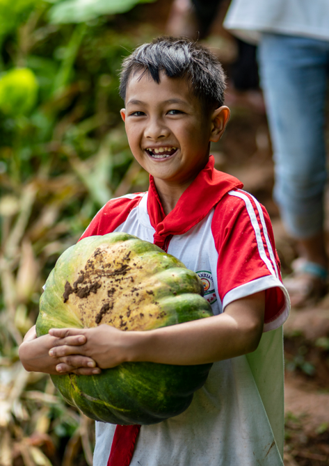 图为木戛乡哈卜吗村小学生李亚八,抱着收获的南瓜返回校园。