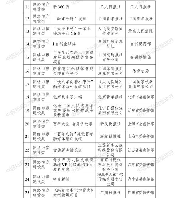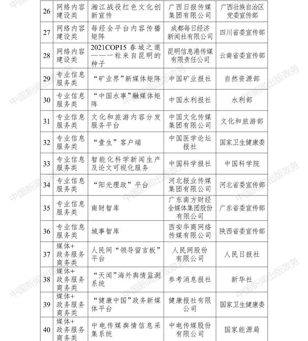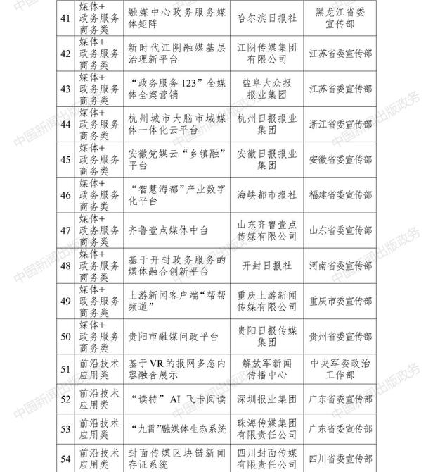据悉,本次评选全国共有60个项目入选,其中全媒体传播体系建设类6个,网络内容建设类22个,专业信息服务类8个,媒体+政务服务商务类14个,前沿技术应用类5个,体制机制创新类5个。
